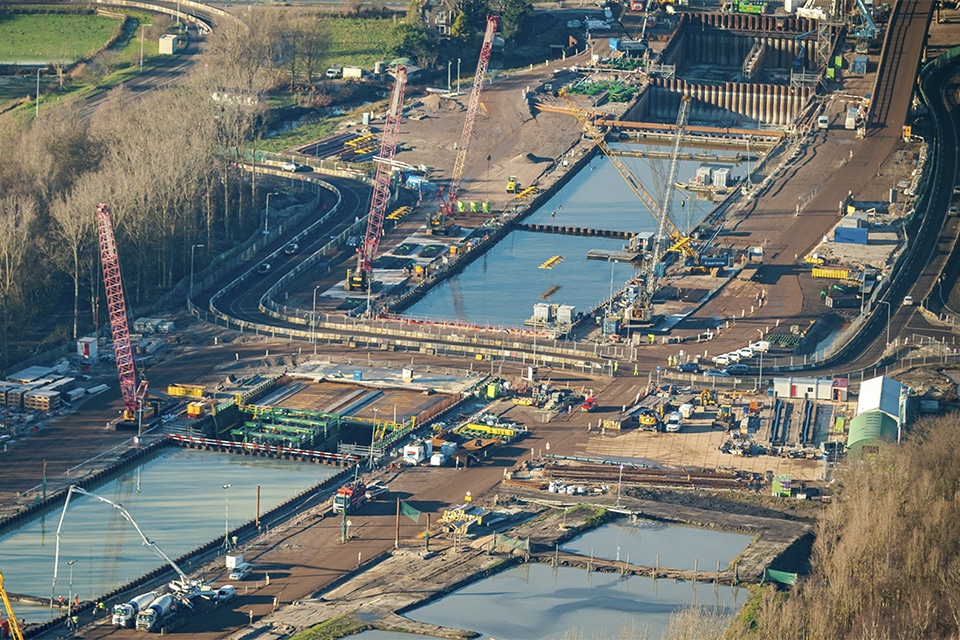De fly-over is ondertussen klaar, net als de Rottemerentunnel trouwens. Al worden hier volgens Behaeghel nog wel de puntjes op de ‘i’ gezet. De 2,2 kilometer lange tunnel steekt slechts een meter uit boven het maaiveld. “Inmiddels is er een terp overheen aangebracht en zijn er bomen op het tunneldak aangeplant, zodat je straks niets meer van de tunnel ziet”, verzekert hij ons, en vertelt dat bij de bouw van de tunnel ook de nodige optimalisaties zijn behaald. “De grootste winst zit ‘m in het feit dat we hebben gewerkt met een vloer van gewapend onderwaterbeton, die tevens als constructievloer dient en dus geen tijdelijke functie heeft zoals bij een klassieke bouwmethode. Het is de eerste keer dat het op deze schaal is toegepast. Duurzaamheid was daarbij de belangrijkste drijfveer, want het scheelt een enorme hoeveelheid aan beton en je hoeft minder diep te ontgraven.”