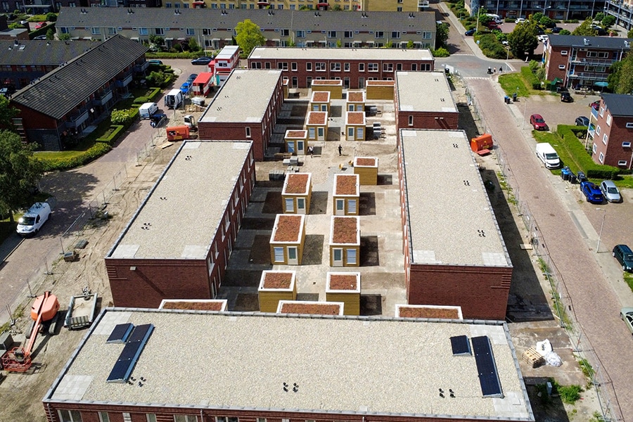 Het balletje voor de samenwerking kwam al in 2023 aan het rollen, toen Winans Dakwerken werd uitgenodigd om mee te denken over een standaard dakbedekkingsconcept voor de Fijn Wonen woningen. “Zowel voor de uitbouwen van de grondgebonden woningen als voor de daken van de appartementencomplexen”, vertelt Peter Dibbets, Operationeel Manager bij Winans Dakwerken. “Echter werd op dat moment gekozen voor EPDM-daken, waarvoor wij niet concurrerend genoeg waren. Kort geleden kwamen wij echter opnieuw in beeld met onze bitumineuze dakbedekkingen, die zich onderscheiden door een hoge kwaliteit, duurzaamheid en lange levensduur. Doordat de dakbedekking losmaakbaar wordt opgebouwd, spelen we bovendien in op de circulaire ambitie van Fijn Wonen.”
