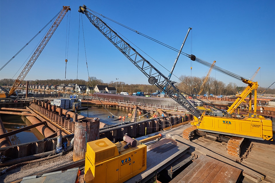 Ruim voor de start van het project werd Verboon Maasland al benaderd door Van Oord, medepartner in het consortium, om mee te denken over de ontgraving van de bouwkuipen. “Aanvankelijk werd gedacht aan de inzet van draadkranen voor het gehele project, maar al snel bleek dat dit technisch niet haalbaar was”, vertelt Sjors Kouwenhoven, uitvoerder bij Verboon Maasland. “De draadkranen zouden te veel druk op de damwanden uitoefenen en bovendien was de beschikbare ruimte in veel situaties krapper dan vooraf ingeschat. Uiteindelijk werden de ‘specials’ rondom De Rotte nog wel met draglines ontgraven, maar voor het grootste deel werd gekozen voor hydraulische kranen vanaf pontons.”